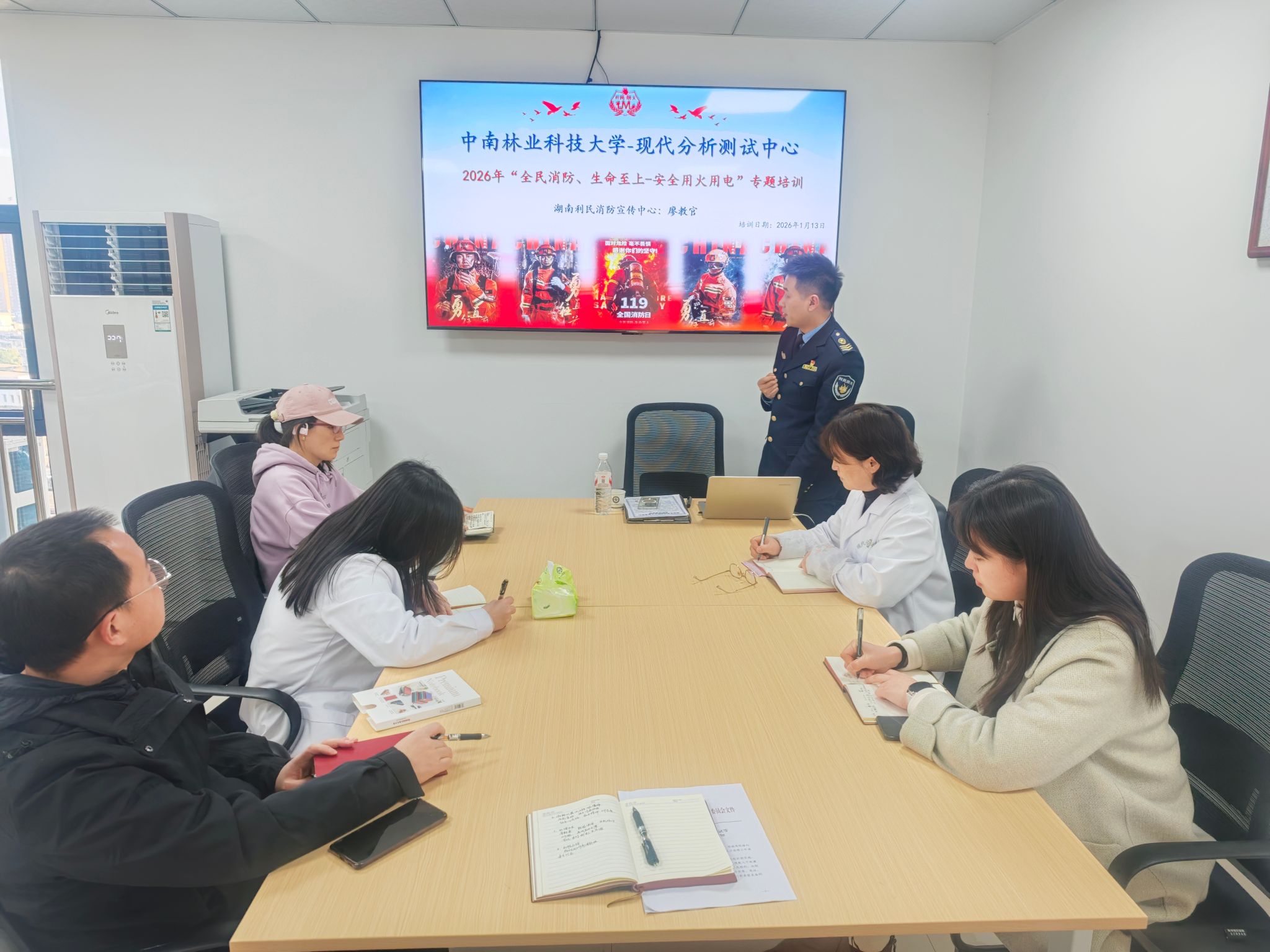 2026年1月13日下午,现代分析测试中心在躬行楼1201办公室组织全体教职工开展“全民消防、生命至上——安全用火用电”专题培训,特邀湖南省利民消防安全服务中心廖光勇教官现场授课。